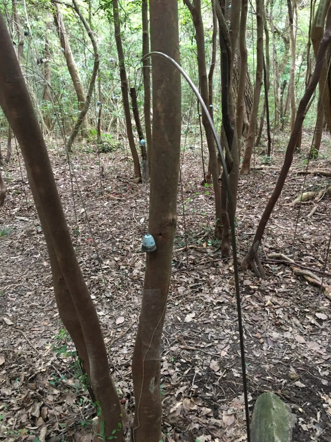 The ‘Murmuring Forests’ installation is composed of several hundred small metal wind chimes, hanging from pieces of metal at different heights in the forest. It was subtle yet powerful, like the Teshima Art Museum. Once you get your eye in you will see more of the wind chimes in this image. Even though the wind was light on the day I visited, the chimes were still mesmerising. Wind chimes (Furin), also known as wind bells, are a common sight and sound in Japan, especially in summer when they are used to suggest the coolness of a breeze. An added dimension in this art work is the addition over time of the names of beloved ones on the transparent wind catcher than hangs from the bell. Each wind gust is designed to evoke the names of these people.