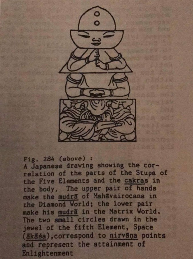 In August 2017 I was very excited to find this diagram of a gorinto in the book “The Symbolism of the Stupa‘ written by Adrian Snodgrass (1985).  The original image was created by the Shingon monk Kakuban. Snodgrass is an expert on Shingon Buddhism. A six element mudra is shown here in the mid triangle-shaped section of the gorinto.  Also known as the ‘Fist of Wisdom’ the mudra equates to the Diamond World Mandala. This diagram shows the elements both in the fingers (mudra) and in the gorinto itself – which represents the body in this example. The links to the cakras (also known as chakras) in the body is of particular interest to me. Elsewhere in his classic book Snodgrass writes that the sixth element, consciousness, is present by implication in the stupa form.