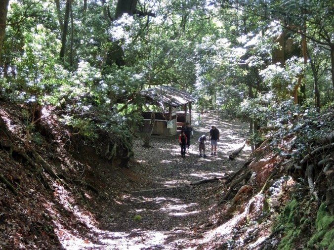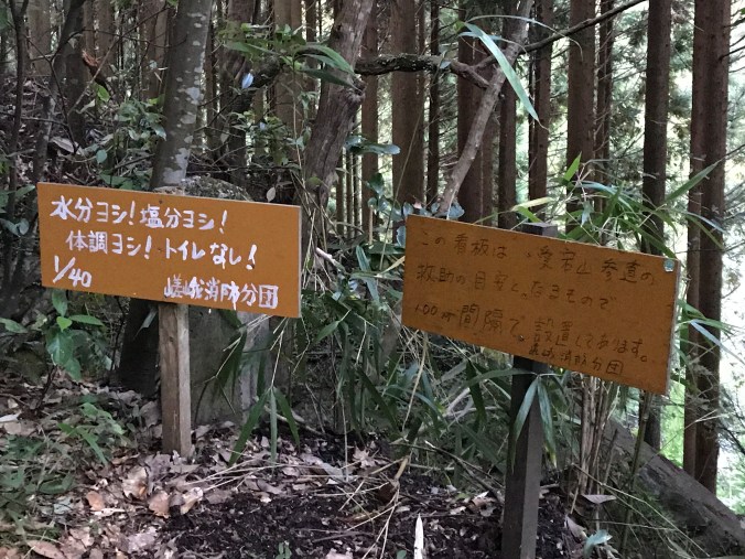 Along the main path to Atago Jinja there are 40 signs at around 100 metre intervals that assist in keeping track of the progress. The total distance to the summit of Atagosan from Kiyotaki is 3.7 km. It helps to take occasional breaks along the way to rest and rehydrate. On the pilgrimage I learnt that the short rest stops are called ‘sho kyu shi‘. That is a useful phrase to remember.