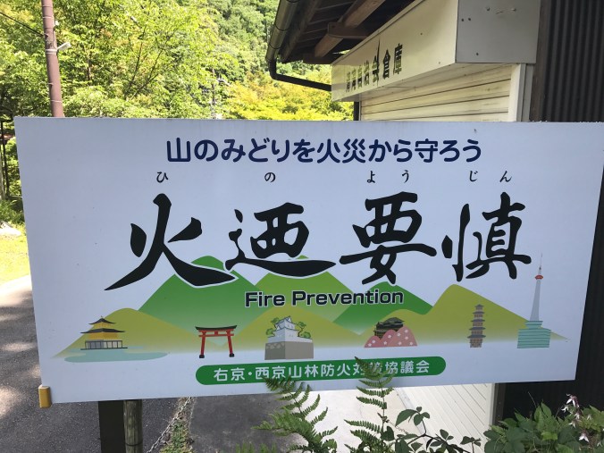 Fire prevention signs are found at the start of the trail to Atagosan, starting just in front of the torii entrance. They continue along the path to the summit. This large sign illustrates some of the major landmarks of Kyoto, ancient and modern. My blog ‘Being careful of fire‘ shares my impressions about fire in the ancient capital, past and present.