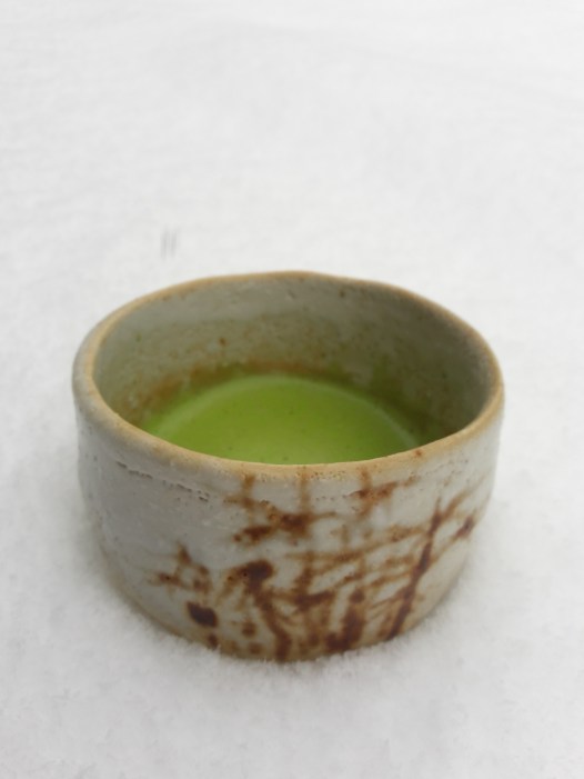 E-Shino Tea Bowl by an unknown craftsman containing vivid green matcha (powdered tea), ready to drink and savour.