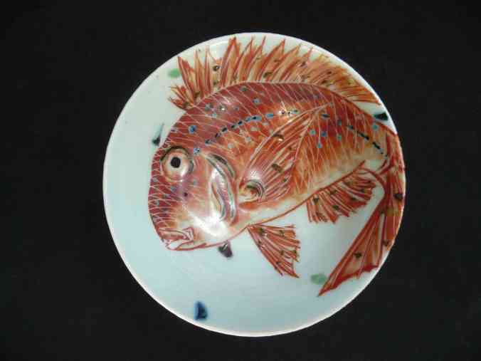 The form of this sake cup lends itself as a great support for painting, as illustrated by this striking image of a tai, or sea bream. It looks like it could jump off the plate.