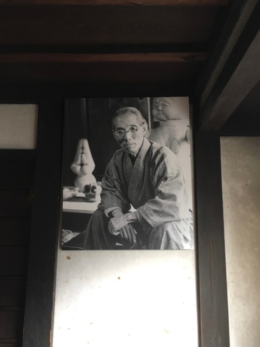 Portrait of Kawai Kanjiro with some of his ground-breaking works in the background.  Taken at the Kawai Kanjiro Museum, Kyoto, this engaging image makes you feel that Kawai-san is in the room with you. When you next find yourself in the ancient city, a visit to his museum is a must.