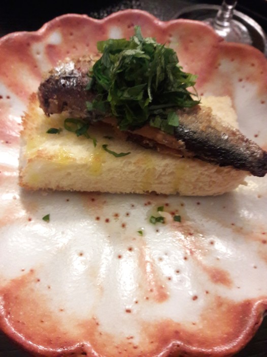 Kiku-zara ceramic attributed to Kato Tokuro. The appetiser is ‘Fried sardine stuffed with Japanese Pickled Plum Paste (Neri Ume) and topped with Fresh Shiso Chiffonade, served on toast’. The fusion of Japanese ingredients with those from other cuisines is a feature of Tatsuo’s cooking. The presentation is quintessentially Japanese.